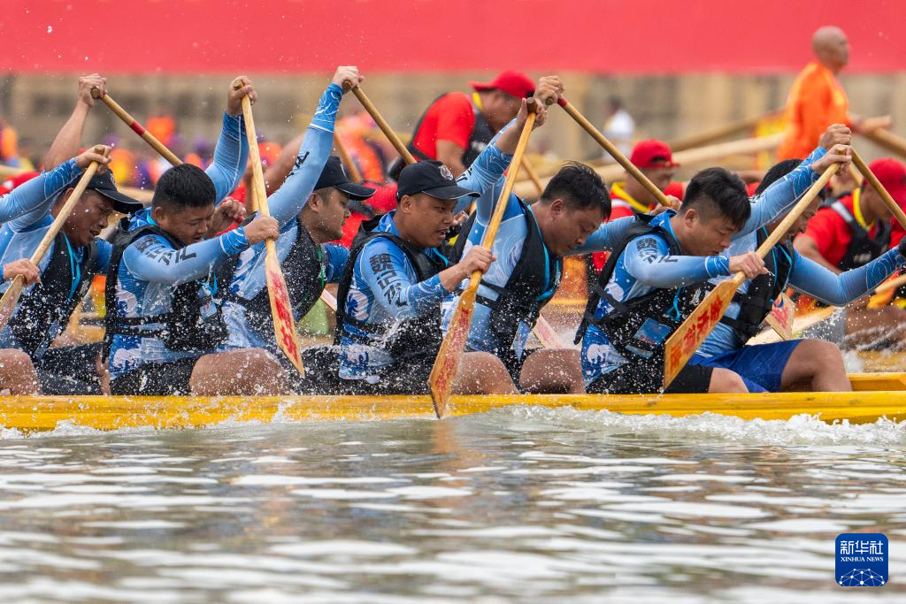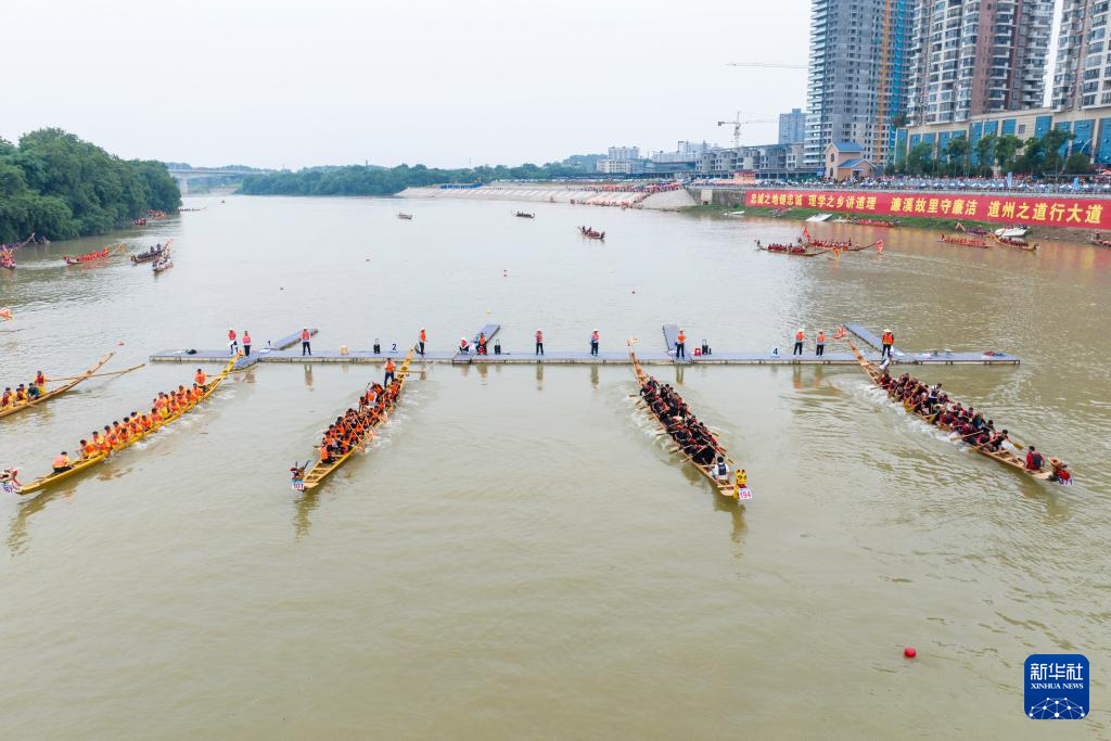当日,“国家非遗道州龙船传统赛”在湖南永州道县潇水河水域开赛,吸引了当地近200支龙舟队5000余人同台竞技,奋楫竞渡,迎接端午节的到来。