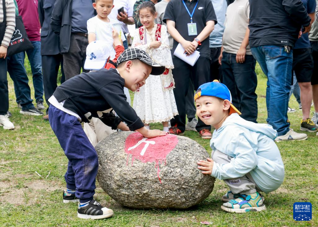 5月24日,在新疆阿勒泰市汗德尕特蒙古族乡,两名小游客在抱石头比赛间隙尝试推动巨石。