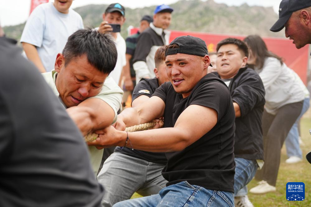 5月24日,在新疆阿勒泰市汗德尕特蒙古族乡,选手参加拔河比赛。
