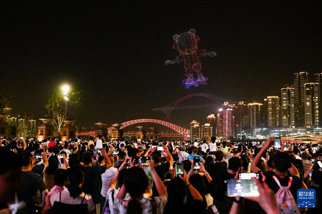 5月2日晚,游客在重庆朝天门广场观看无人机灯光秀。