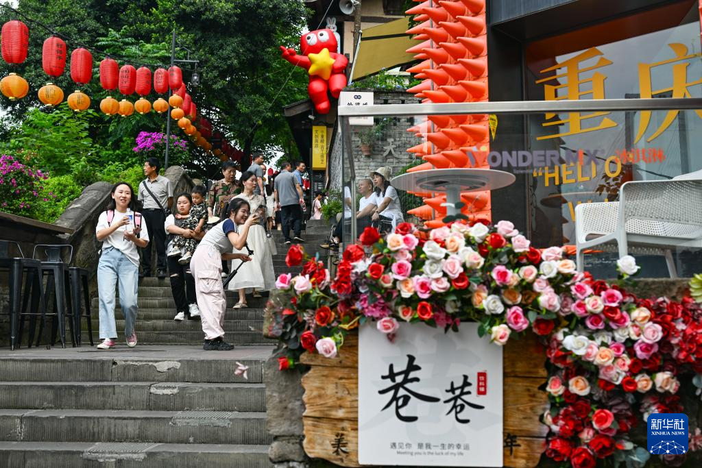 6月8日,游客在重庆市渝中区山城巷游览、拍照。