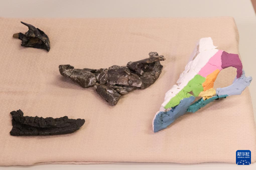 这是1月7日在匈牙利布达佩斯洛兰大学举行的新闻发布会上拍摄的科兹玛奥伊考角龙头骨化石及其3D复制模型。