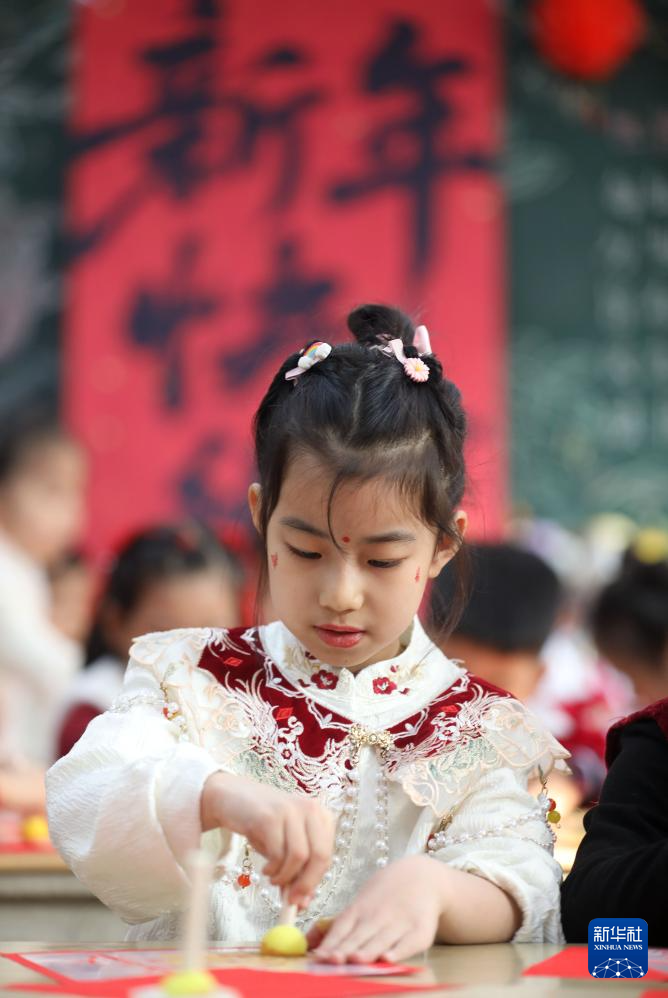 1月23日,一名小朋友在河北省沧州市育红小学举办的迎腊八活动上拓印福字。