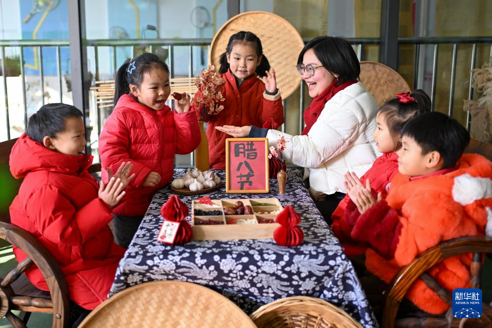 1月23日,在江苏省南京市太平巷幼儿园,老师为小朋友们讲解制作腊八粥的食材。