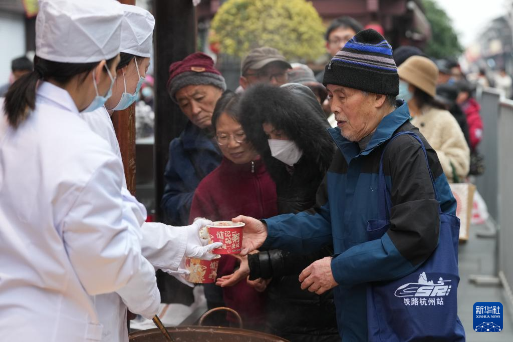 1月26日,市民在杭州河坊街方回春堂领取腊八粥。