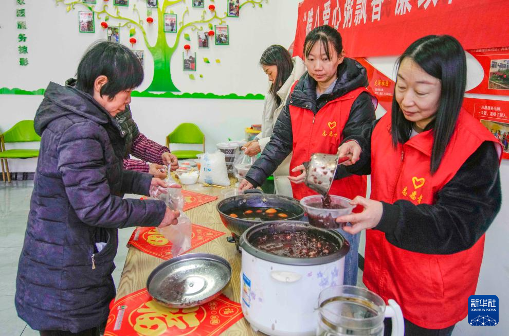 1月26日,在陕西省安康市平利县城关镇东城社区,志愿者为群众送上腊八粥。