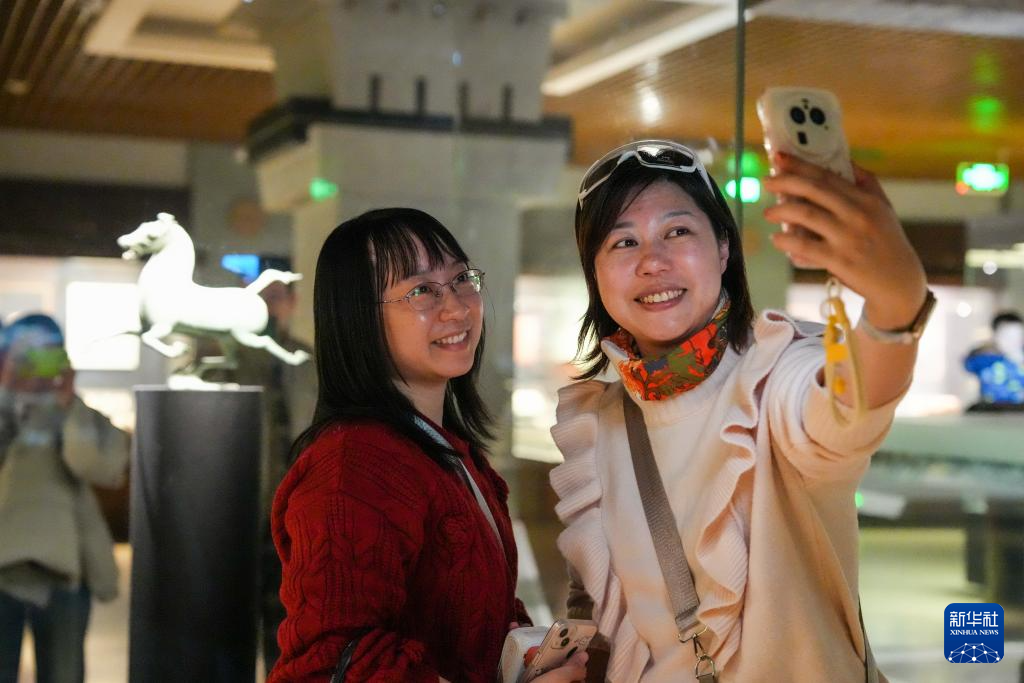 1月26日晚,在甘肃省博物馆二楼丝绸之路文明展厅,观众与东汉铜奔马(复制品)自拍合影。