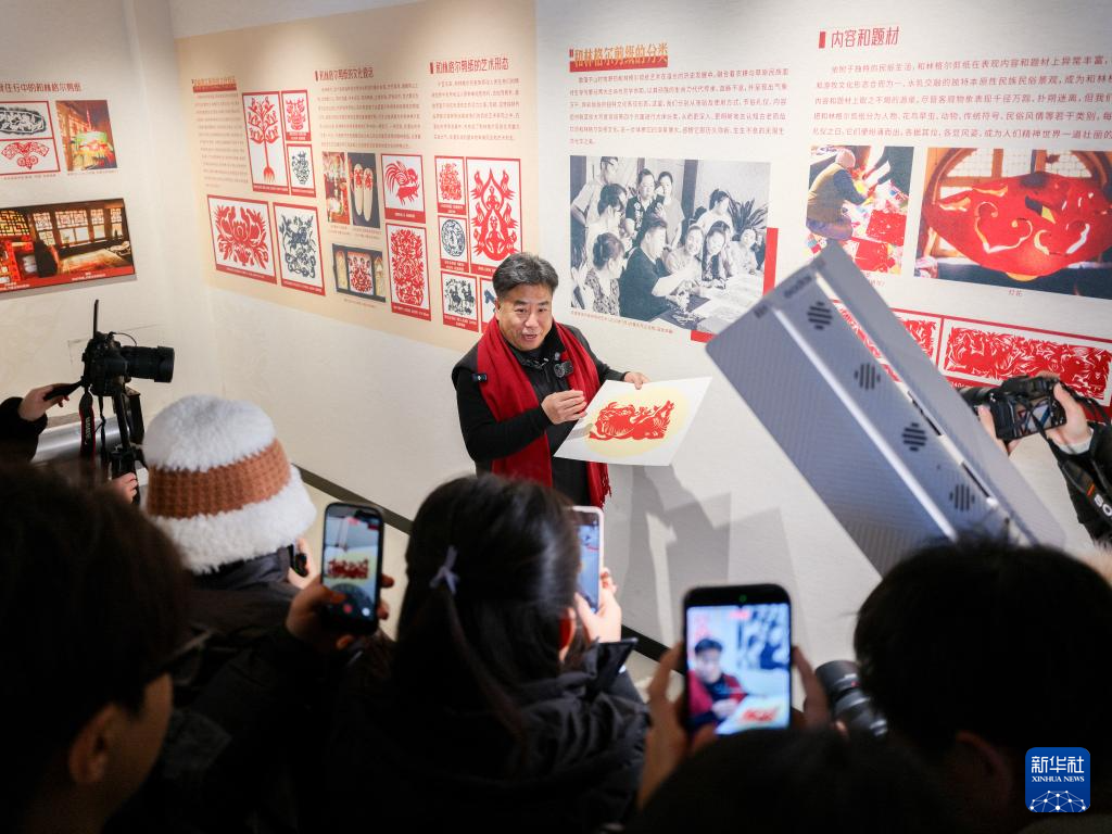 2月4日,学生们在内蒙古呼和浩特市和林格尔土城子国家考古遗址公园剪纸陈列馆交流剪纸技艺。