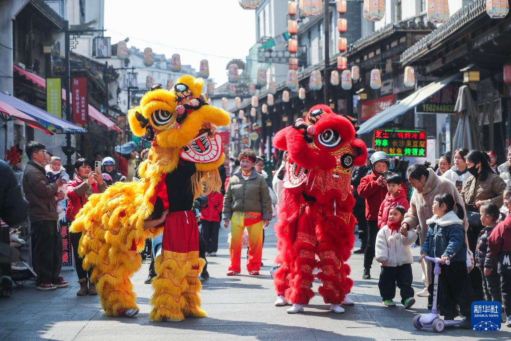 2月8日,游客在寿昌古镇老街上观看传统舞狮表演。