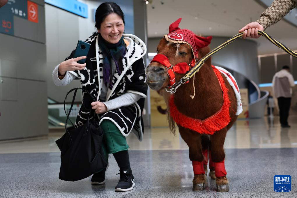2月10日,参观者在展览现场与一匹设特兰矮马互动。