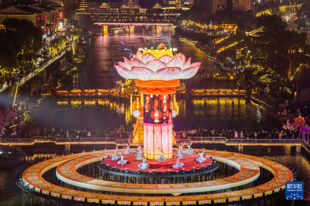 2月11日,市民和游客在湖北省恩施土家族苗族自治州宣恩县贡水河畔赏灯游玩(无人机照片)。