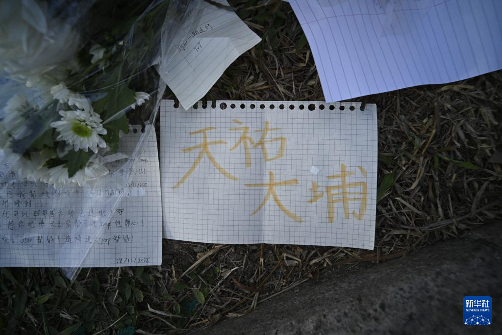 这是11月29日清晨在火灾后的大埔宏福苑楼宇附近拍摄的市民摆放的花束与留言条。新华社发(王申摄)