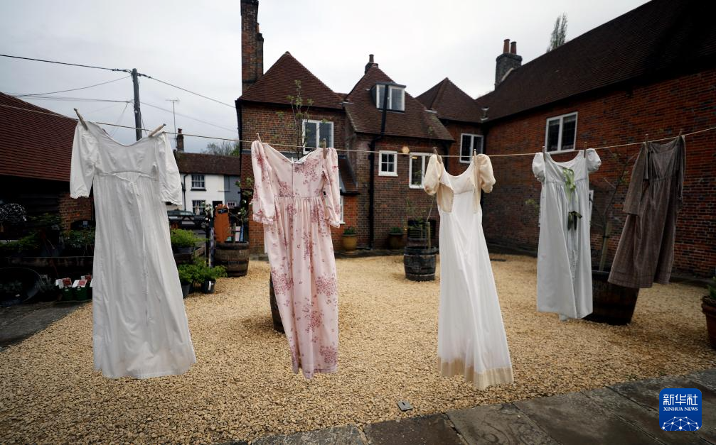 这是4月18日在英国汉普郡乔顿村拍摄的简·奥斯汀故居附近悬挂的衣服。