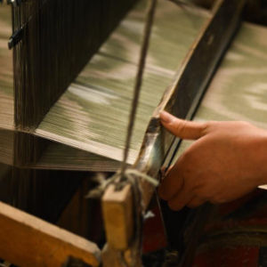 5月13日,在和田吉亚乡一处艾德莱斯绸手工作坊里,工人在使用传统木制织布机织造艾德莱斯绸。