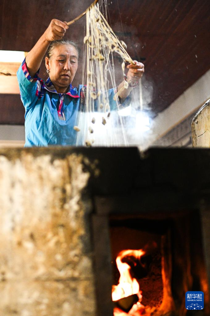 5月13日,在和田吉亚乡一处艾德莱斯绸手工作坊里,苏杜尔汗·阿不都热合木将蚕茧煮沸抽丝。