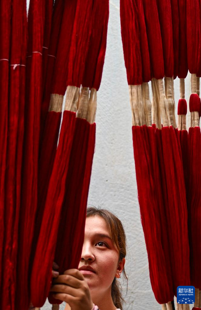5月13日,在和田吉亚乡,祖丽皮亚·杰力力在查看晾晒的丝线。她从小跟着家人制作艾德莱斯绸。