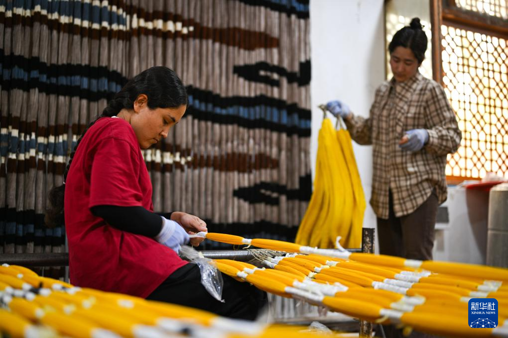 5月13日,在和田吉亚乡一处艾德莱斯绸手工作坊里,工人在捆扎丝线,准备进行染色。