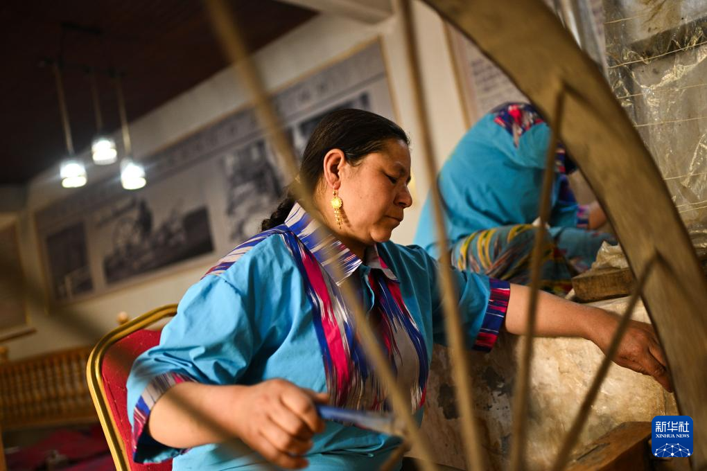 一颗颗蚕茧经过煮沸抽丝、缫丝、设计、捆扎、扎染、整理图案、上机织绸,最终成为艾德莱斯绸。