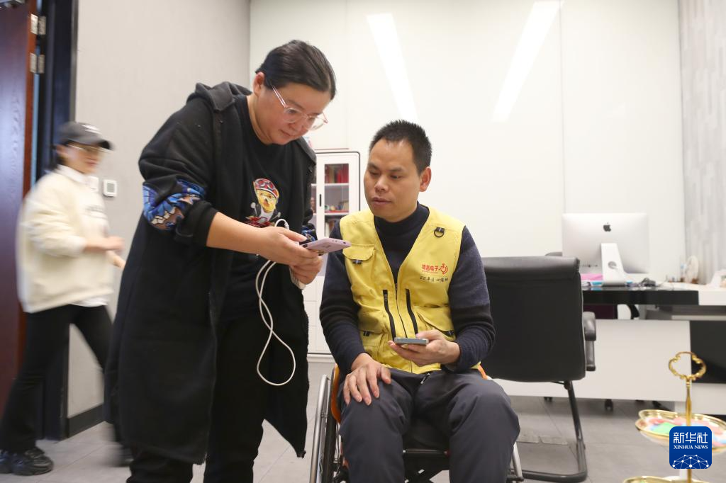 柯水昌在办公室里用通过手机软件跟听障女孩刘莹交流,刘莹在柯水昌的指导和帮助下创业成立了装饰气球和手工艺品制作公司(2023年4月14摄)。