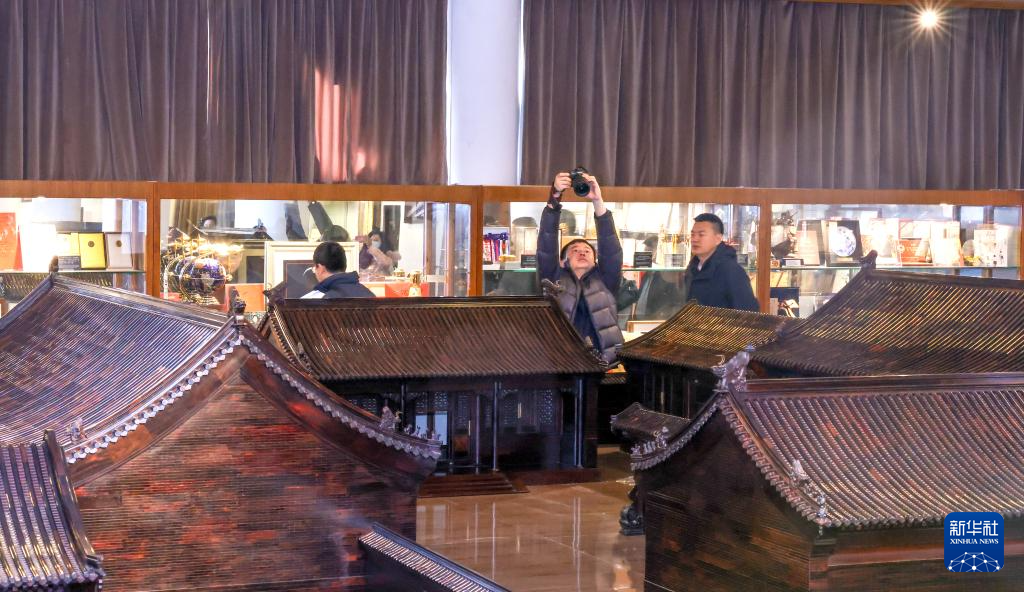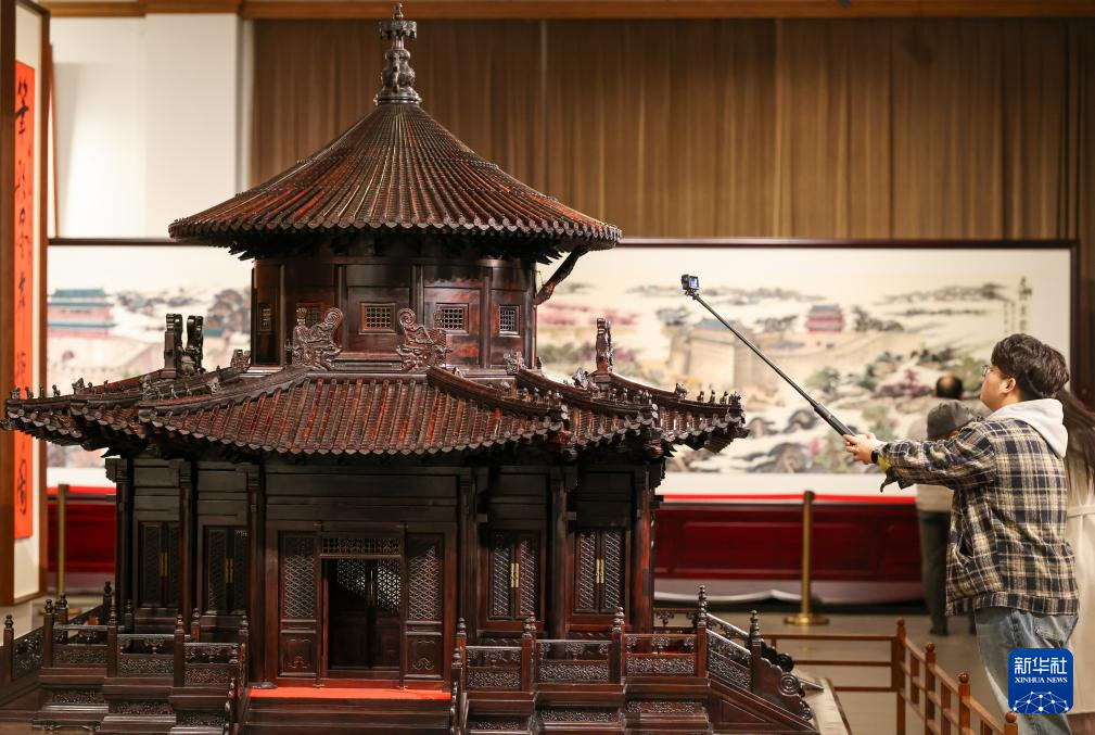 3月15日,游客在中国紫檀博物馆内拍摄古建筑微缩景观。