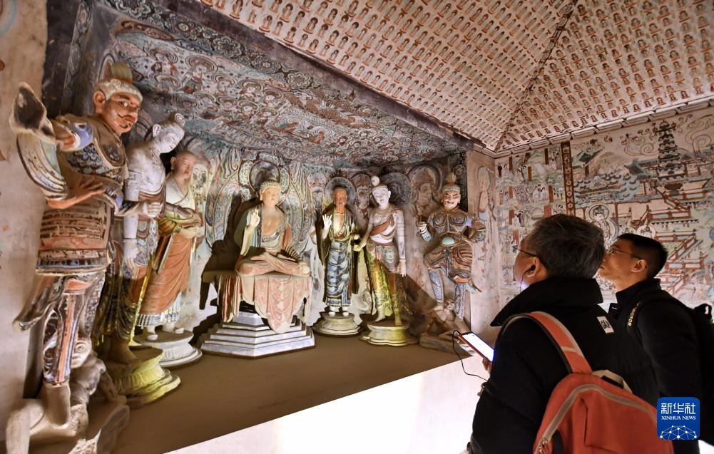 3月29日,观众在参观“如是莫高”敦煌艺术大展中展出的莫高窟第285窟的复刻版本。