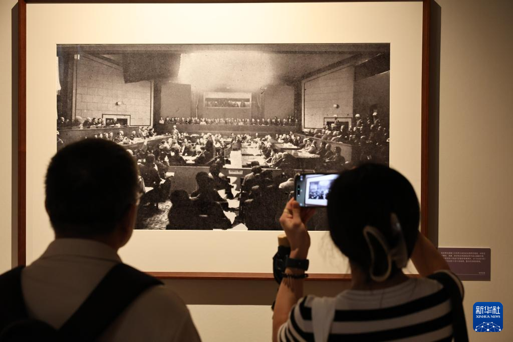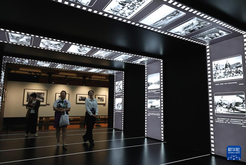 9月1日,参观者在艺术展上展出的抗战主题摄影作品前驻足观看。