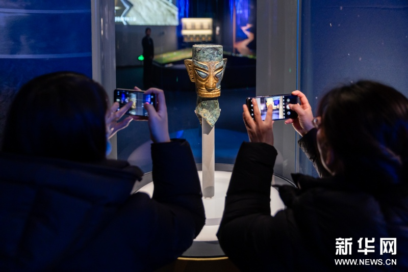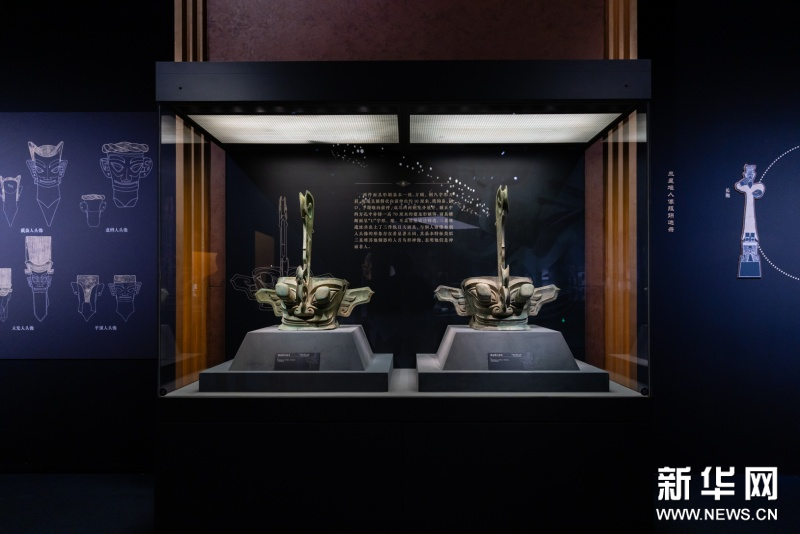 据介绍,本次展览中,包括青铜立人、兽首饰玉璋等37件(套)来自成都金沙遗址博物馆的文物,自其开馆以来从未外展。三星堆博物馆藏戴冠纵目面具与中国国家博物馆藏戴冠纵目面具在本次展览中并列展出,这是自1986年三星堆祭祀坑发掘以来,两件标志性青铜面具首次同台亮相。太阳神鸟金饰将于“文化和自然遗产日”20周年之际再次在国博展出。