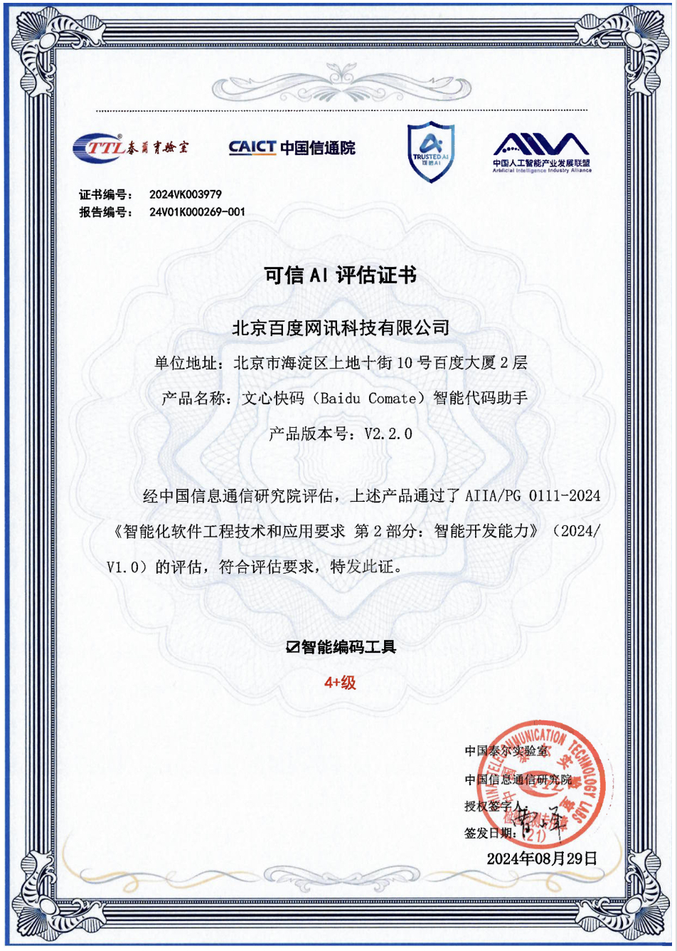 8月29日,中国信息通信研究院(以下简称“中国信通院”)公布了由其组织的可信AI智能编码工具评估结果,国内数十家头部企业参与评估,百度智能代码助手文心快码(Baidu Comate)首轮参与,并获得4+评级,成为国内首批通过该项评估的企业之一。